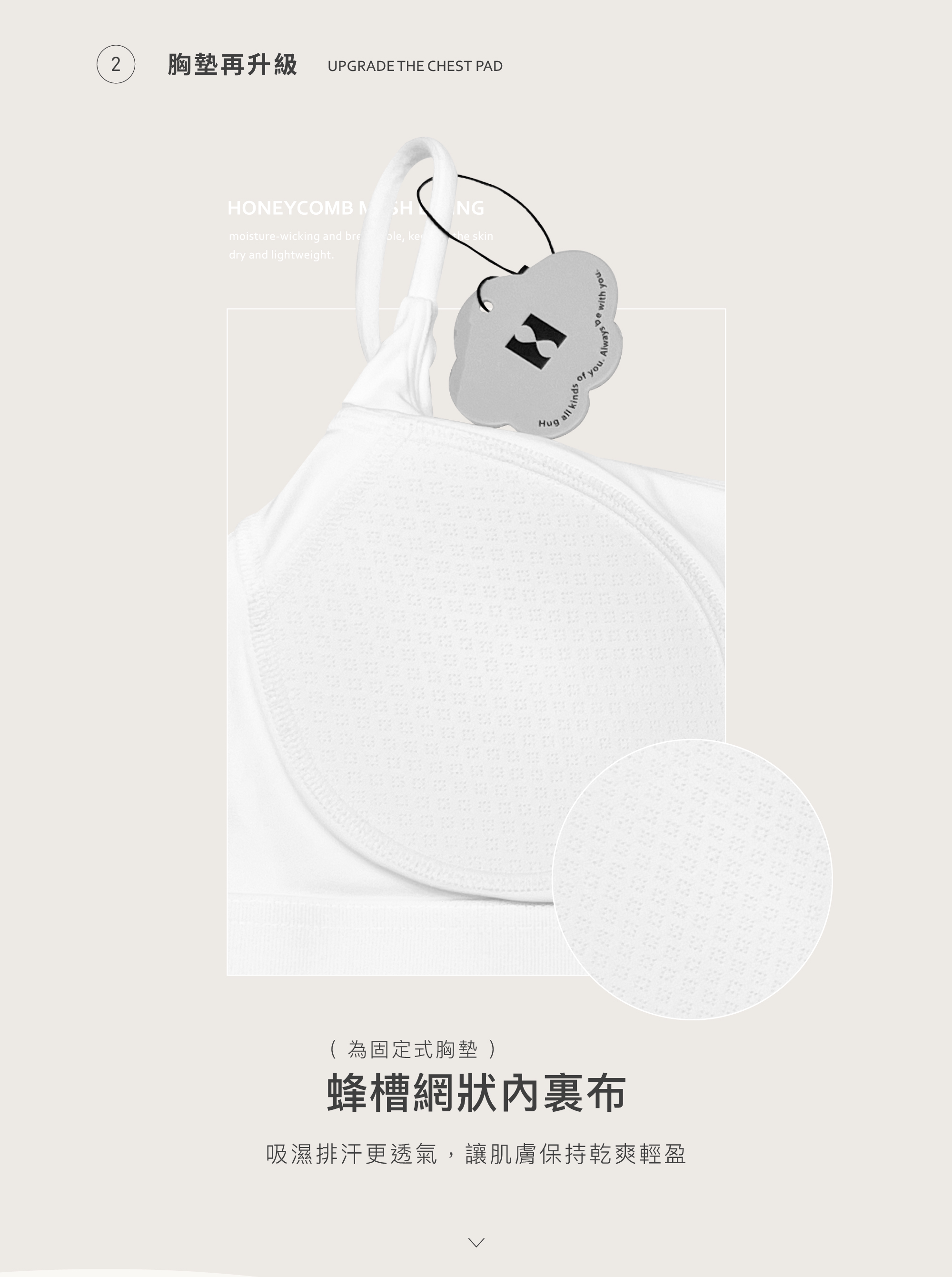 ● 胸墊採用獨家蜂槽網狀內裏布!透氣度加倍